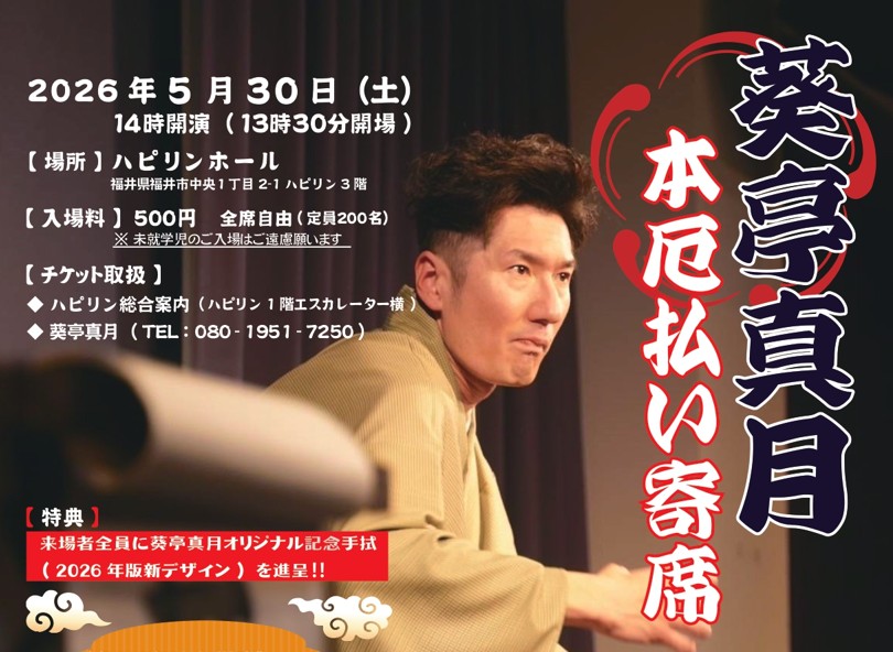 5月30日(土) ハピリンホールで『葵亭真月 本厄払い寄席』を開催!